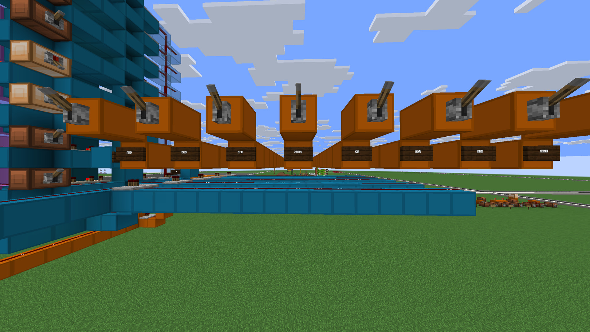 Explain what your build does in detail: It takes 2 inputs and depending on the lever that is turned on it does that operation. It is based off of mattbats CCA adder with added lines to invert the input A, invert the input B, power the carry in or power all the the carry outs. It also has a ROM to use the adder and the lines to ADD A and B, SUBTRACT A and B and also do the bitwise operations XOR, XNOR, OR, NOR, AND and NAND.