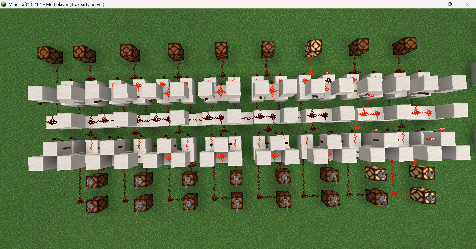 Explain what your build does in detail: My build gets two binary number inputs from the user. The XOR gate of the first half adder produces the first sum of the inputs, and the AND gate produces the first carry. Then, the first sum and the cin are fed into the XOR gate of the second half adder, which produces the final sum. The AND gate of the second half adder produces a second carry, and both carries are combined using an OR gate to form the carry-out (Cout) for the next full adder next to it (Its stackable!). The final sum is used to turn on the restone lamp, indicating the result of the addition.