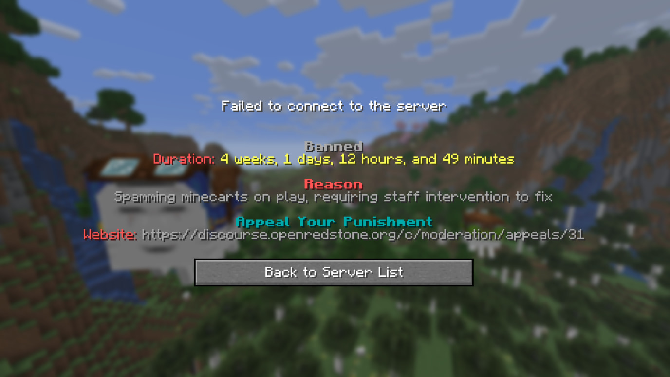 Why you were banned (if known): Spamming minecarts on play, requiring staff intervention to fix(Rule 8)